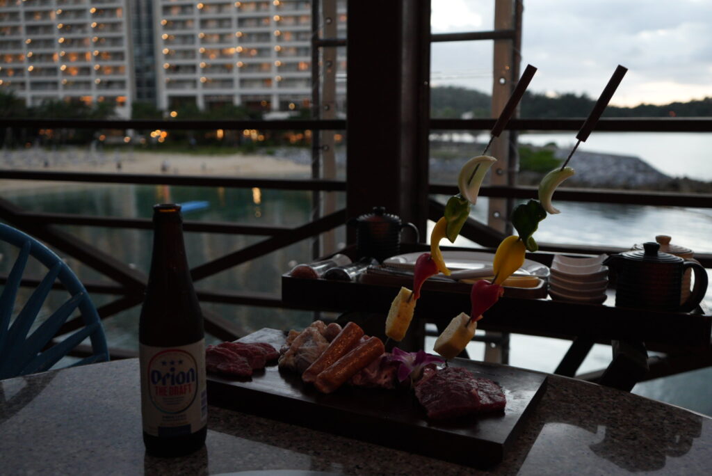 食事の途中でちょうど夕陽の時間を迎え、海風を感じながら沖縄らしい雰囲気でのディナーを堪能できました。東シナ海に沈む夕日を眺めながら食べるBBQは、リゾートならではの特別な体験です。