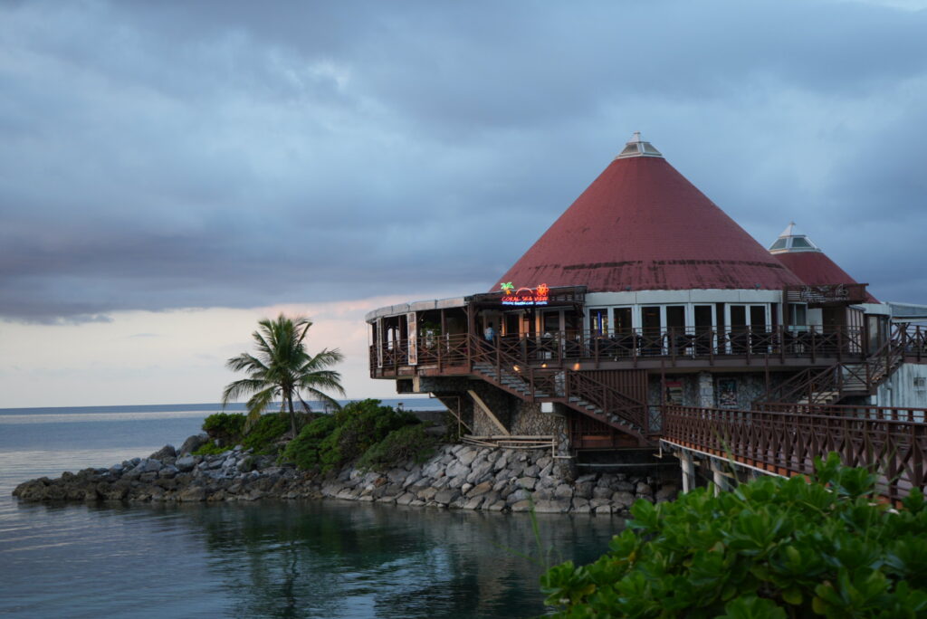 夕食は、ルネッサンスビーチの隣に位置する海上BBQレストラン「コーラルシービュー」へ。珊瑚礁に突き出た桟橋を渡った先にある赤い三角屋根のレストランで、ホテルのアイコン的存在でもあります。