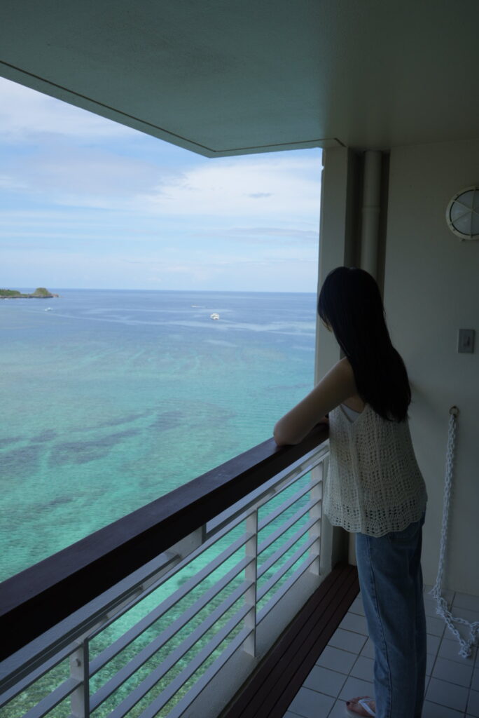 高層階からのバルコニービューは格別です。特に朝の光に輝くルネッサンスビーチと東シナ海のエメラルドグリーンは、写真に収めずにはいられない美しさでした。