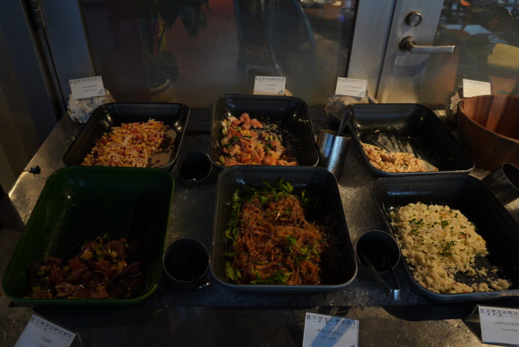 • 前菜・サラダ:ロミロミサーモン、ガーリックシュリンプ、アヒポキ、ロールサンドなど
